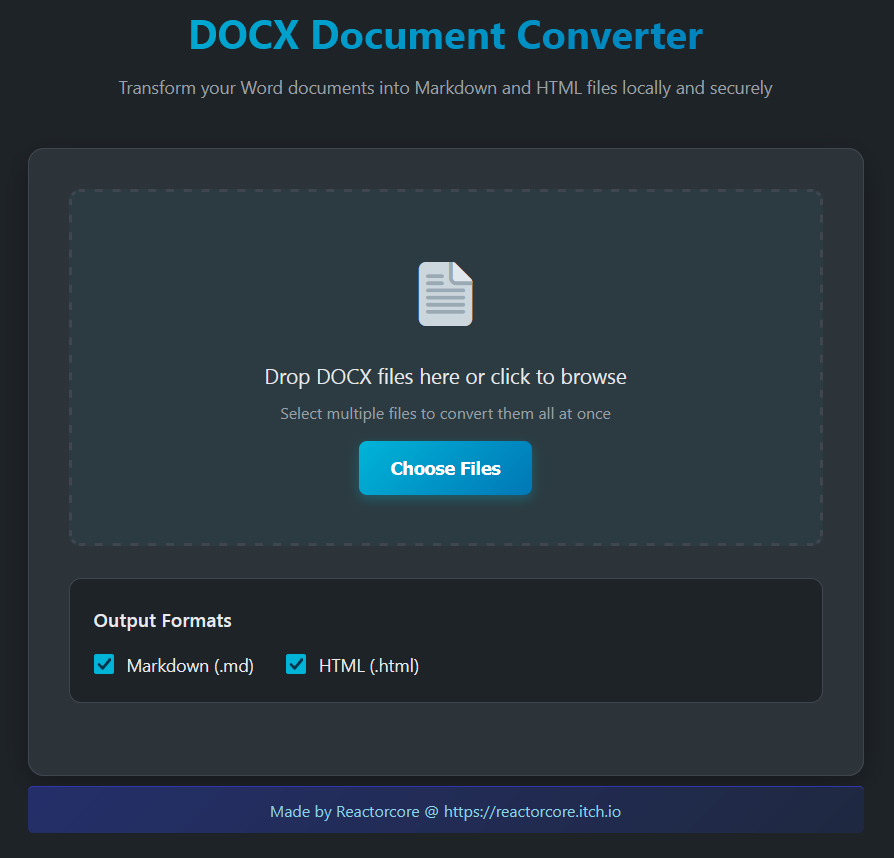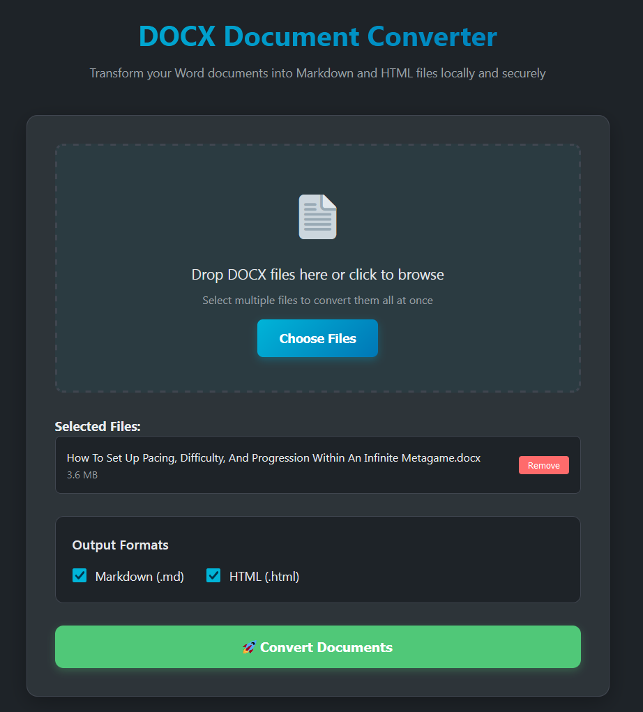 Tags | batch-processing, converter, developer-tools, document-conversion, docx, html, markdown, privacy, tool, web-app |
