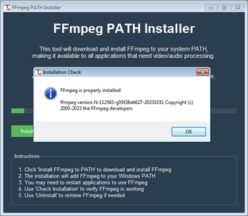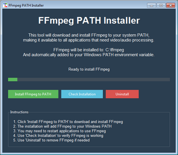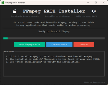 A simple GUI application that automatically installs FFmpeg to Windows PATH for easy access by other applications.