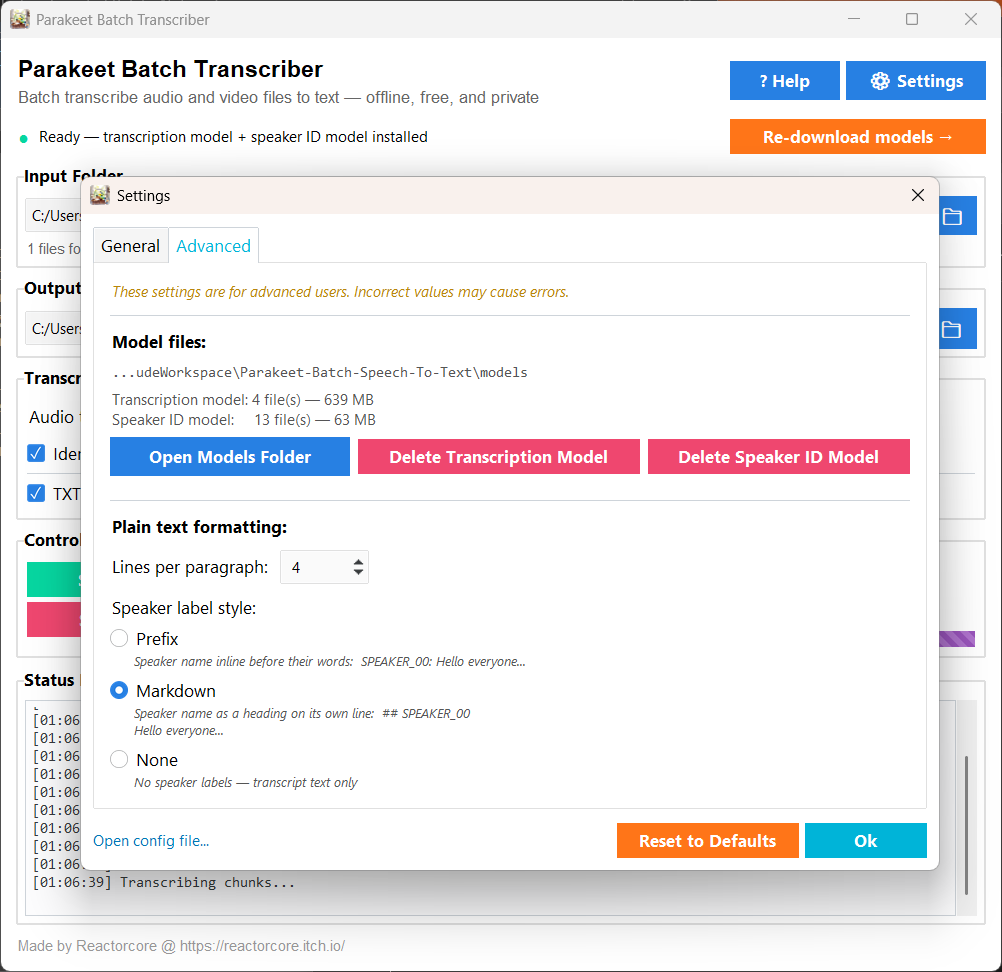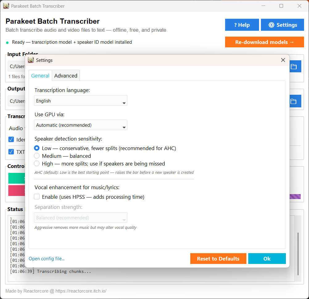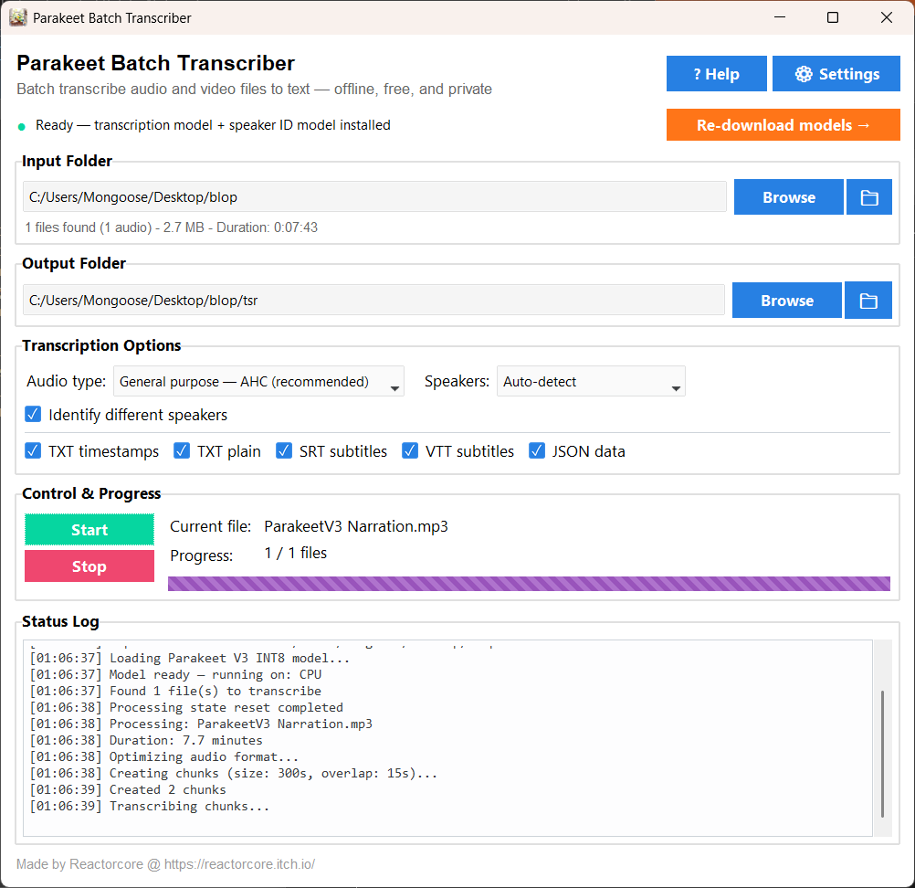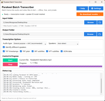 There is an option to do a one-time model download (~715 MB, including Parakeet V3 and SpeechBrain) via Hugging Face, but the provided zip package you'll download on this page has them already pre-included so you can just boot up the exe and do your transcriptions right away.