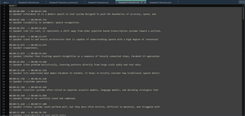- Speaker identification — labels who's talking (SPEAKER_00, SPEAKER_01, etc.)
