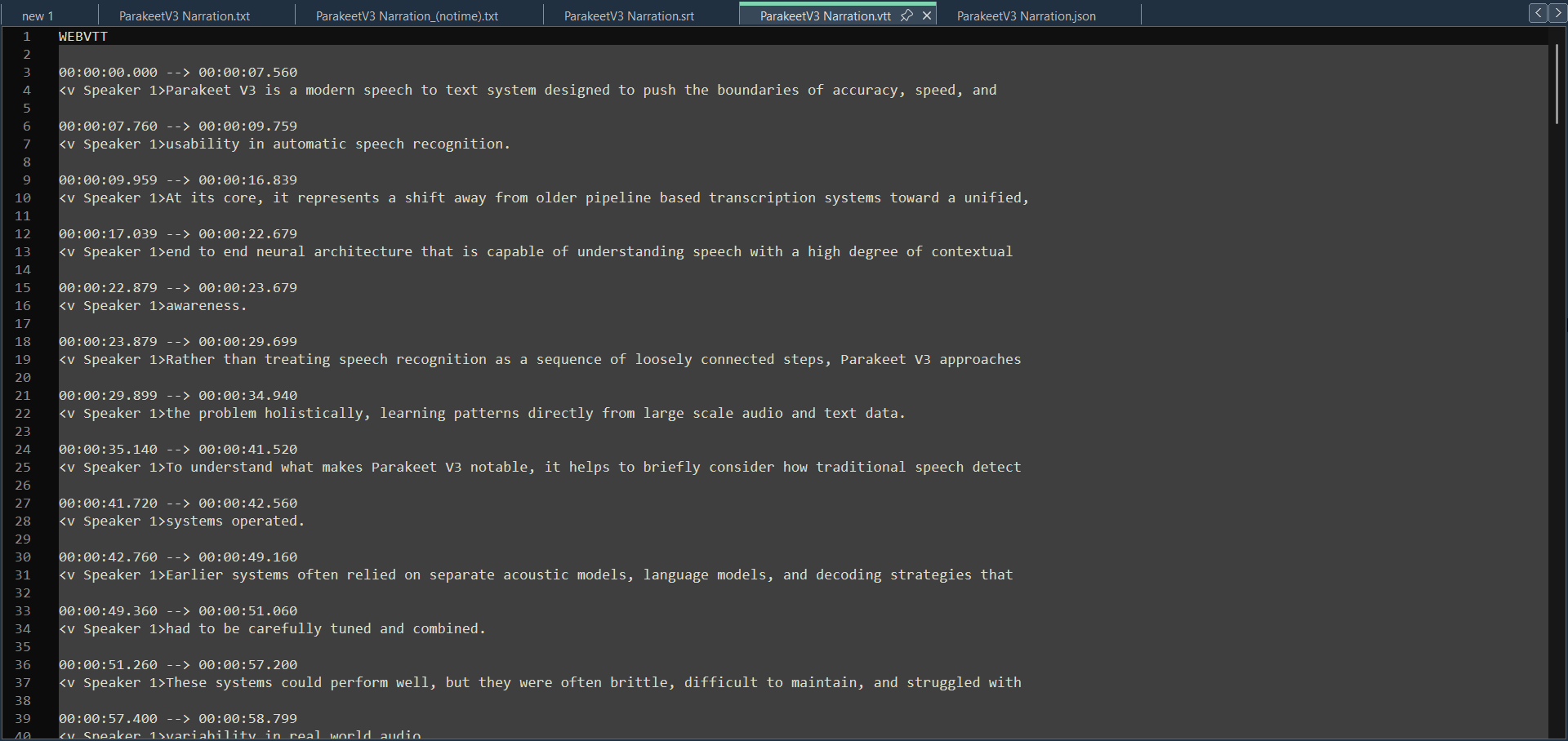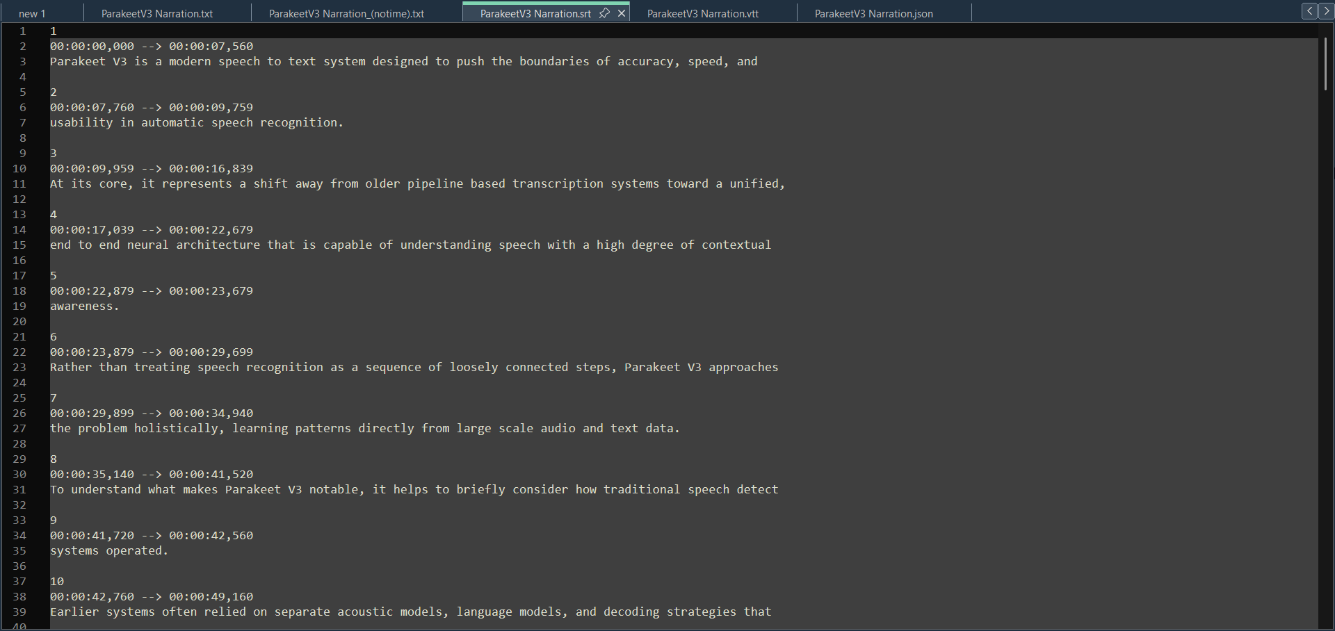 - SRT and VTT subtitles — drop straight into a video editor or media player